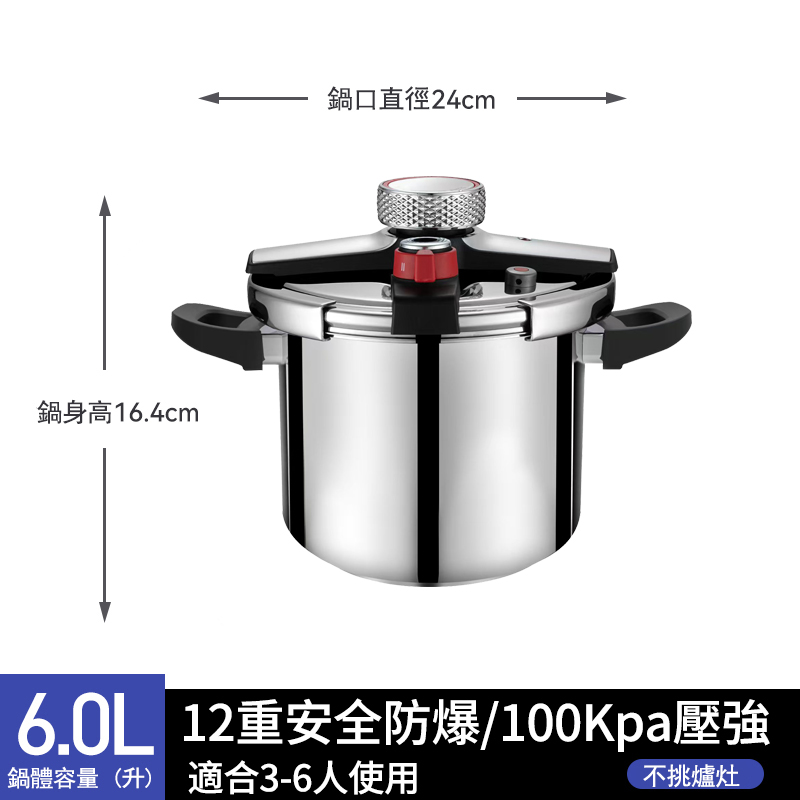 11分鐘前【年底換新大促】燃氣電磁爐通用【德國進口】304不鏽鋼壓力鍋 煮飯/熬粥/炖肉 自動限壓閥排氣保護安全防爆 耐用20年不壞 不滿意包退換 - 升級加厚 6L【適合1-4人使用】304不鏽鋼壓力鍋 NT$2680