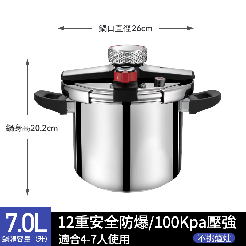 20分鐘前【年底換新大促】燃氣電磁爐通用【德國進口】304不鏽鋼壓力鍋 煮飯/熬粥/炖肉 自動限壓閥排氣保護安全防爆 耐用20年不壞 不滿意包退換 - 升級版八重保護304不鏽鋼重力閥7L強力壓力鍋(4-7人)NT$2780