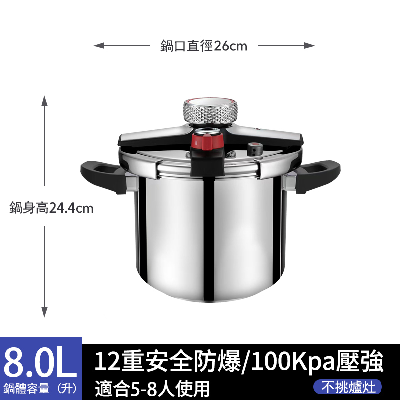 15分鐘前【年底換新大促】燃氣電磁爐通用【德國進口】304不鏽鋼壓力鍋 煮飯/熬粥/炖肉 自動限壓閥排氣保護安全防爆 耐用20年不壞 不滿意包退換 - 升級加厚 8L【適合5-8人使用】304不鏽鋼壓力鍋 NT$3080