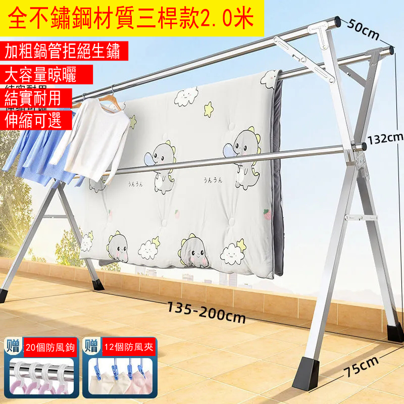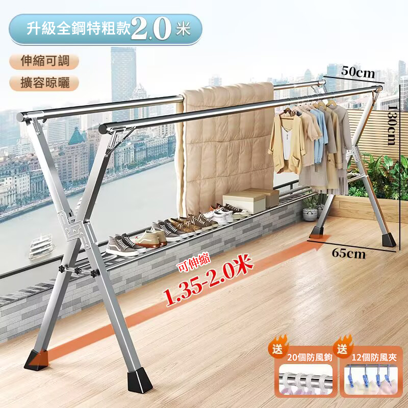 2分鐘前【下單即送20個防風掛鉤】不鏽鋼免安裝折疊家用伸縮式晾衣架 - 2025升級鞋架款2.0米 【可伸縮-送20個防風鉤+12個防風夾】NT$1990