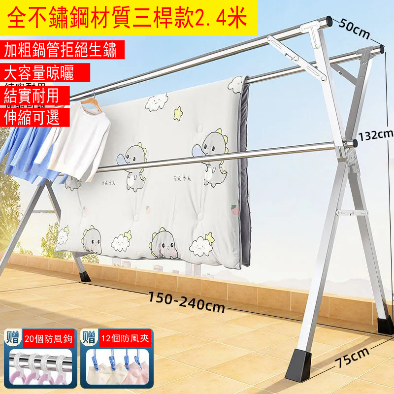 5分鐘前【下單即送20個防風掛鉤】不鏽鋼免安裝折疊家用伸縮式晾衣架 - 2025升級鞋架款2.4米 【可伸縮-送20個防風鉤+12個防風夾】NT$2090