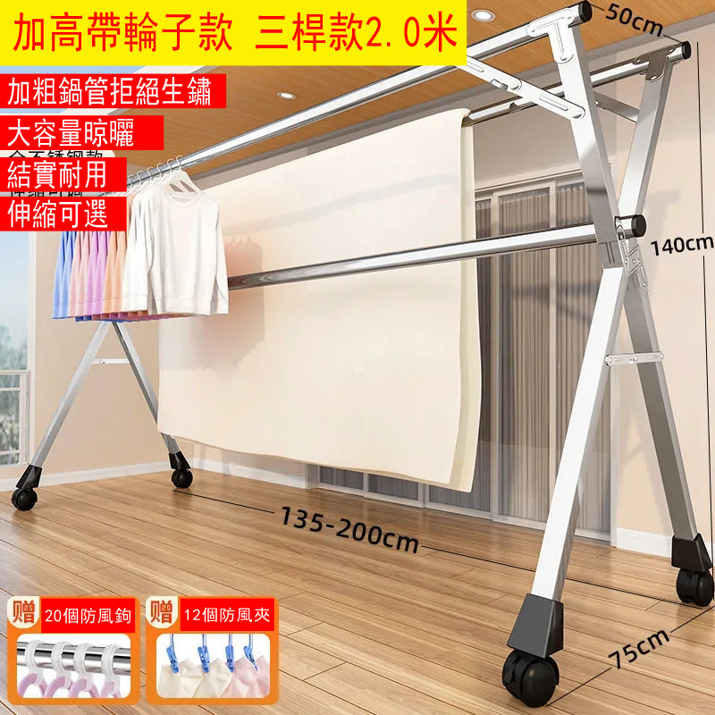 7分鐘前【下單即送20個防風掛鉤】不鏽鋼免安裝折疊家用伸縮式晾衣架 - 2025升級款加萬向輪2.0米【可伸縮-送20個防風鉤+12個防風夾】 NT$1890