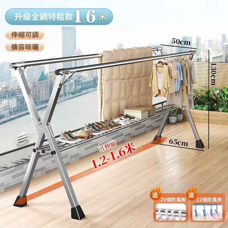 7分鐘前【下單即送20個防風掛鉤】不鏽鋼免安裝折疊家用伸縮式晾衣架 - 2025升級鞋架款1.6米 【可伸縮-送20個防風鉤+12個防風夾】NT$1890