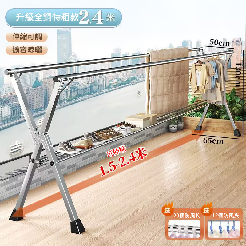半小時前【下單即送20個防風掛鉤】不鏽鋼免安裝折疊家用伸縮式晾衣架 - 2025升級鞋架款2.4米 【可伸縮-送20個防風鉤+12個防風夾】NT$2090