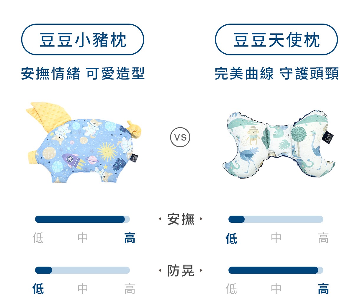 A2:可依照寶寶的實際頭頸部發展狀況決定。天使枕更能保護及貼合寶寶頭型,適合外出以及固定頭頸需求使用;而小豬枕則較為平坦,具有較強安撫性質、適合日常使用。
