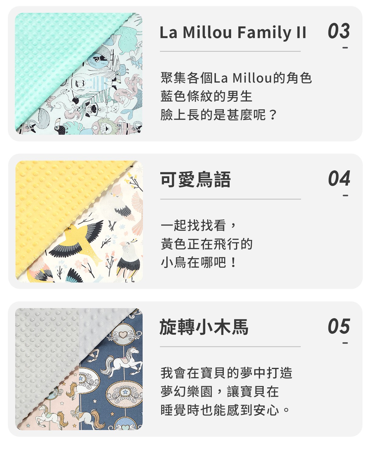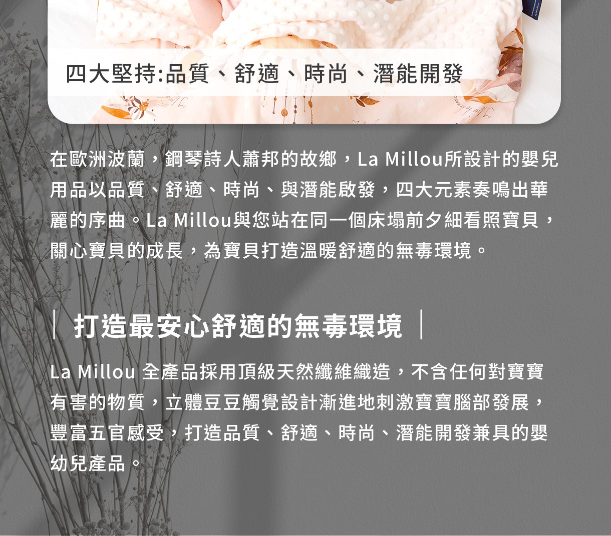 La Millou自2010年創立至今,已連續獲得國內外多項獎項,包括知名的Institute of Mother and Child、The Mam Dzieco Super product Award、mombaby媽媽寶寶,好評蟬連十年,重視美感、設計感、觸感的媽咪,寶貝們絕不容錯過。