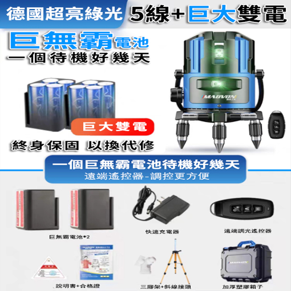 5分鐘前熱銷破萬件!戶外清晰可見【德國MAOVON】歐司朗綠光2/3/5線鐳射儀 - 【5線】巨大雙電+三腳架 +遙控 NT$3550